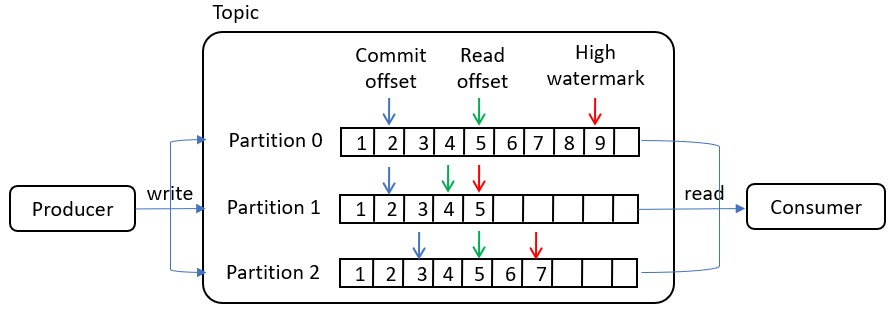 - Partitions are replicated in different brokers. Default topic replication factor is 3. Redundancy of messages in case of broker failure.