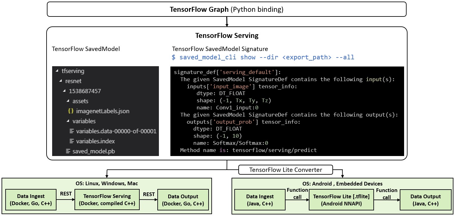 An overview of the TensorFlow SavedModel building and deploying process is illustrated here.