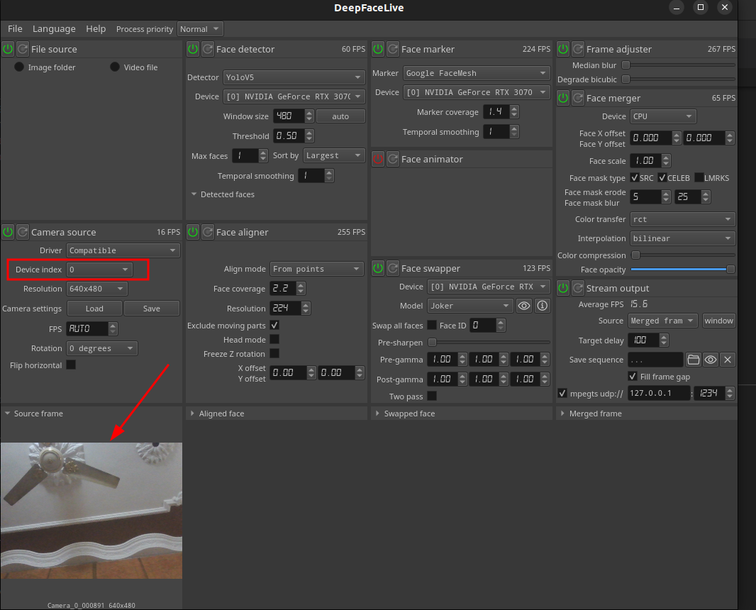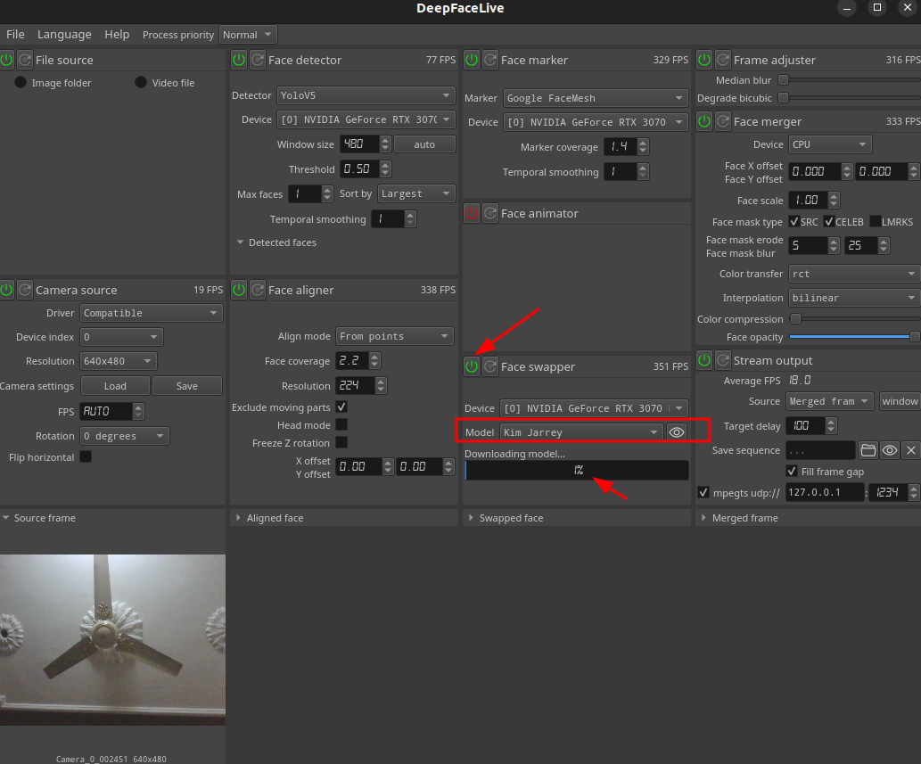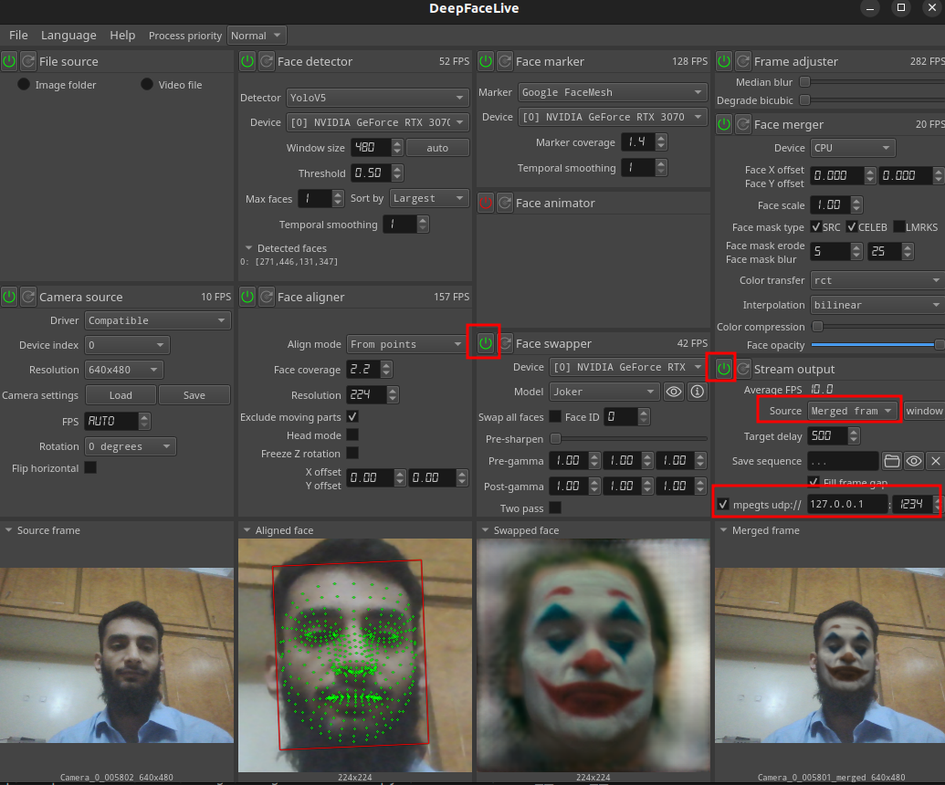 Once you can see a swapped result, selected ‘Merged output’ from the drpodown and tick the checkbox to output result as a UDP stream.