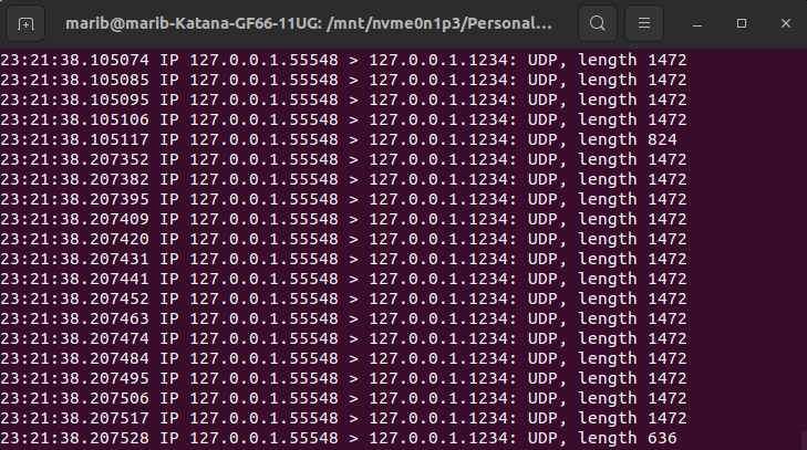 tcpdump -i lo -n udp port 1234The output should look something like below